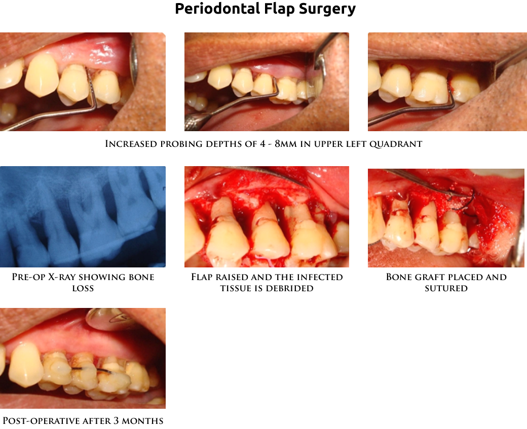 Periodontal flap surgery : It's done to reduce the pockets. The infection in the deeper portion of the gums are cleaned under local anesthesia. A cut is given, and the gums are raised above and hard deposits and infection is scraped and removed. Sometimes, in addition, bone grafts, gum grafts or guided tissue membranes may be needed to cover the root surface. The gums are sutured back. The loose gums are tightly attached to the bone after the healing period. Interdental aids need to be routinely used to keep the area clean.